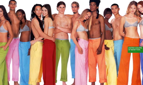 La campagna "United Colors of Benetton" trascendeva la tradizionale pubblicità di moda. Invece di mostrare prodotti, queste immagini affrontavano temi come razzismo, guerra, AIDS, pena di morte e distruzione ambientale. Un prete che bacia una suora. Un neonato ancora ricoperto di vernice caseosa. Tre cuori umani etichettati "Bianco", "Nero" e "Giallo".