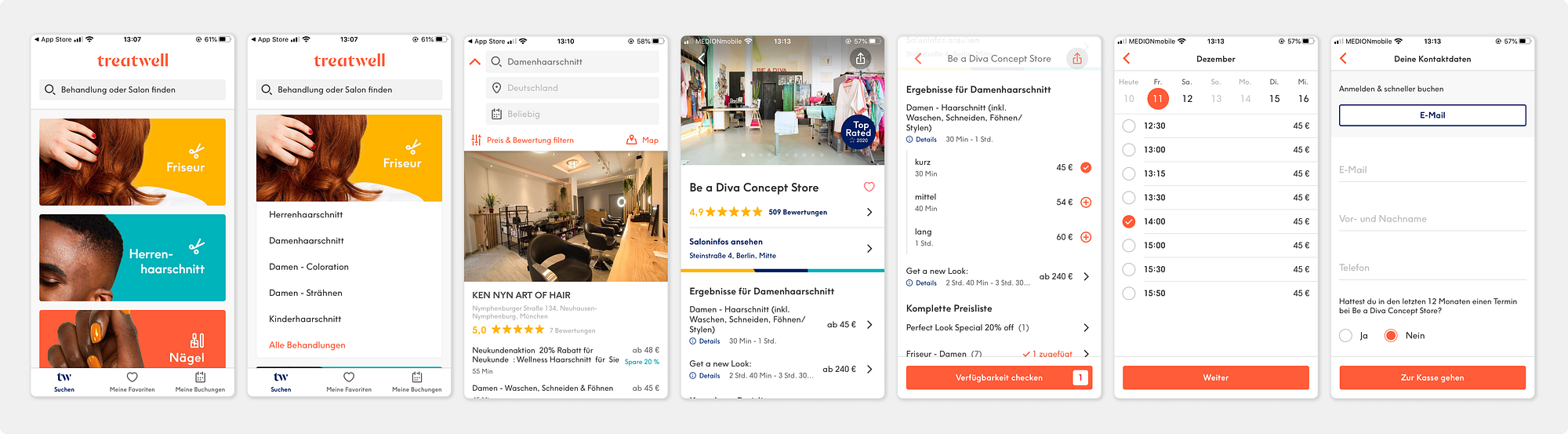 消费者旅程: 用户下载应用程序或访问网站,按地点、护理类型或特定沙龙名称进行搜索。搜索结果会显示照片、价格、空位情况和评价评分。选择时间段后,即可轻松完成结账——既可通过平台预付,也可到店后付款。